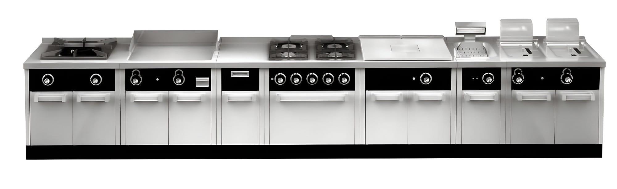 - Urządzenia dostępne w modułach o szerokości 400, 800 i 1200 mm, głębokości 750 mm w wersji nastawnej, z szafką otwartą, szafką zamkniętą oraz kuchnie z piekarnikiem