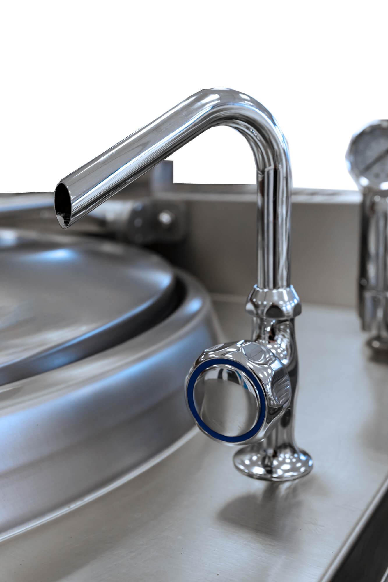 - Zbiornik ogrzewacza napełniany jest wodą za pomocą kranu z obrotową wylewką, z dwoma osobnymi przyłączami do wody uzdatnionej i zimnej wody z sieci
