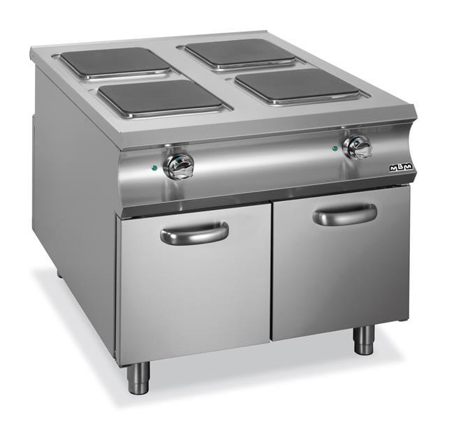 Linia kuchni elektrycznych obejmuje modele z 2 lub 4 płytami kwadratowymi dostępne jako monobloki (urządzenia wolnostojące). Monoblok: na podstawie z 3 stron zamkniętej lub ze statycznym piekarnikiem elektrycznym GN 2/1. Wyposażenie: • Blat ze stali nierdzewnej AISI 304 18/10 o grubości 2 mm • Szybko nagrzewające się żeliwne płyty grzejne z zabezpieczeniem przed przegrzaniem (300x300 mm) • Elementy grzejne o mocy 3 kW lub 4 kW z 7-pozycyjnym termostatem zapewniającym optymalne sterowanie mocą • Wodoszczelne mocowanie płyt grzejnych do blatu kuchni Prosta obsługa: • Sterowanie z dwóch stron • Lampki kontrolne wskazujące działanie każdej płyty • Nowoczesne, ergonomiczne pokrętła w górnej części panelu przedniego • Łatwość montażu wszystkich elementów z przodu Konserwacja: • Zaokrąglone narożniki oraz formowane wgłębienia pozwalają na gromadzenie się cieczy, zapobiegają jej wypływowi i ułatwiają mycie