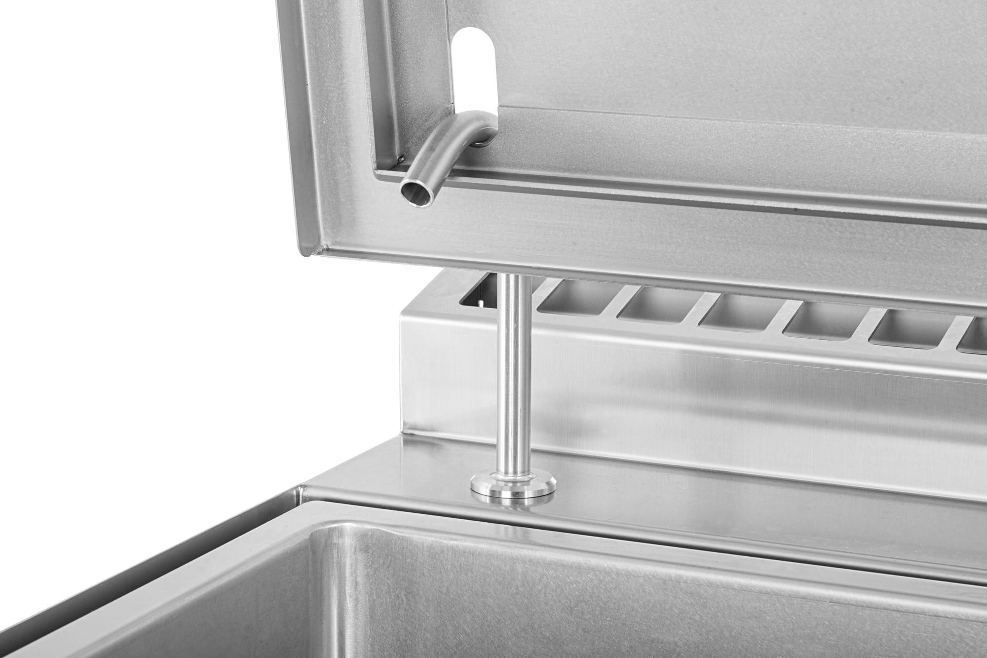 - Grube dno wanny patelni jest dodatkowo wzmocnione płytą ze stali nierdzewnej, pozwala na równomierne rozprowadzanie ciepła na całej powierzchni roboczej