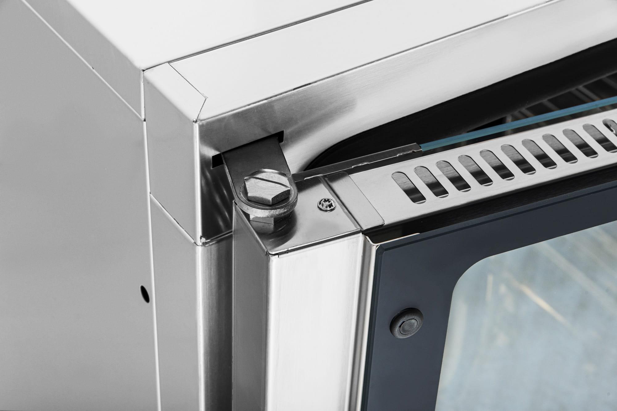- Prowadnice wykonane z wytrzymałych profili ze stali nierdzewnej umożliwiają korzystanie z blach GN 1/1 oraz blach cukierniczo-piekarniczych 600x400mm.