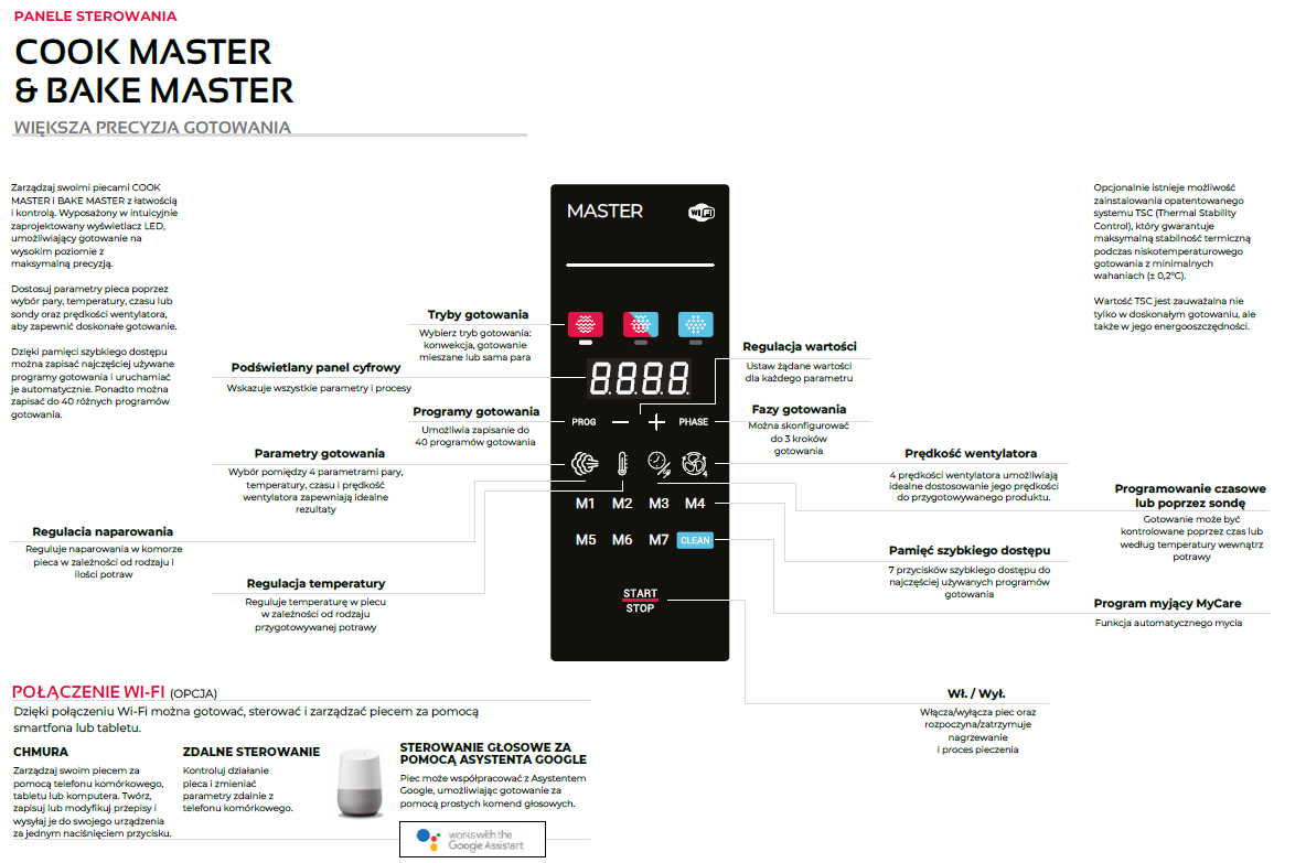 - 3 tryby gotowania: Konwekcja (od 30° do 260°C) / Mieszany: konwekcja + para (od 30° do 260°C) /para wodna nasycona (od 30° do 130°C)