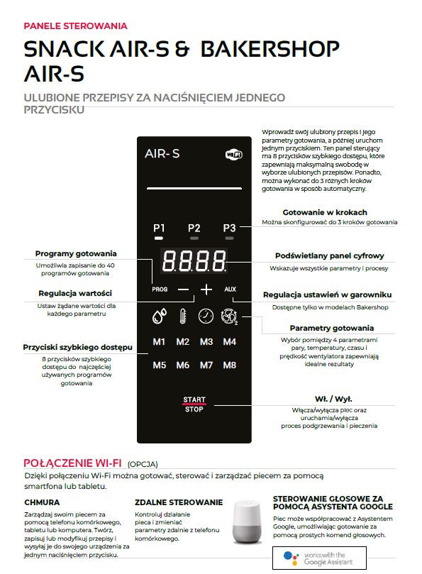- Piec posiada 2 tryby gotowania: Konwekcja (od 30 °C do 260 °C)/Mieszany: konwekcja + para (od 30 °C do 260 °C)
