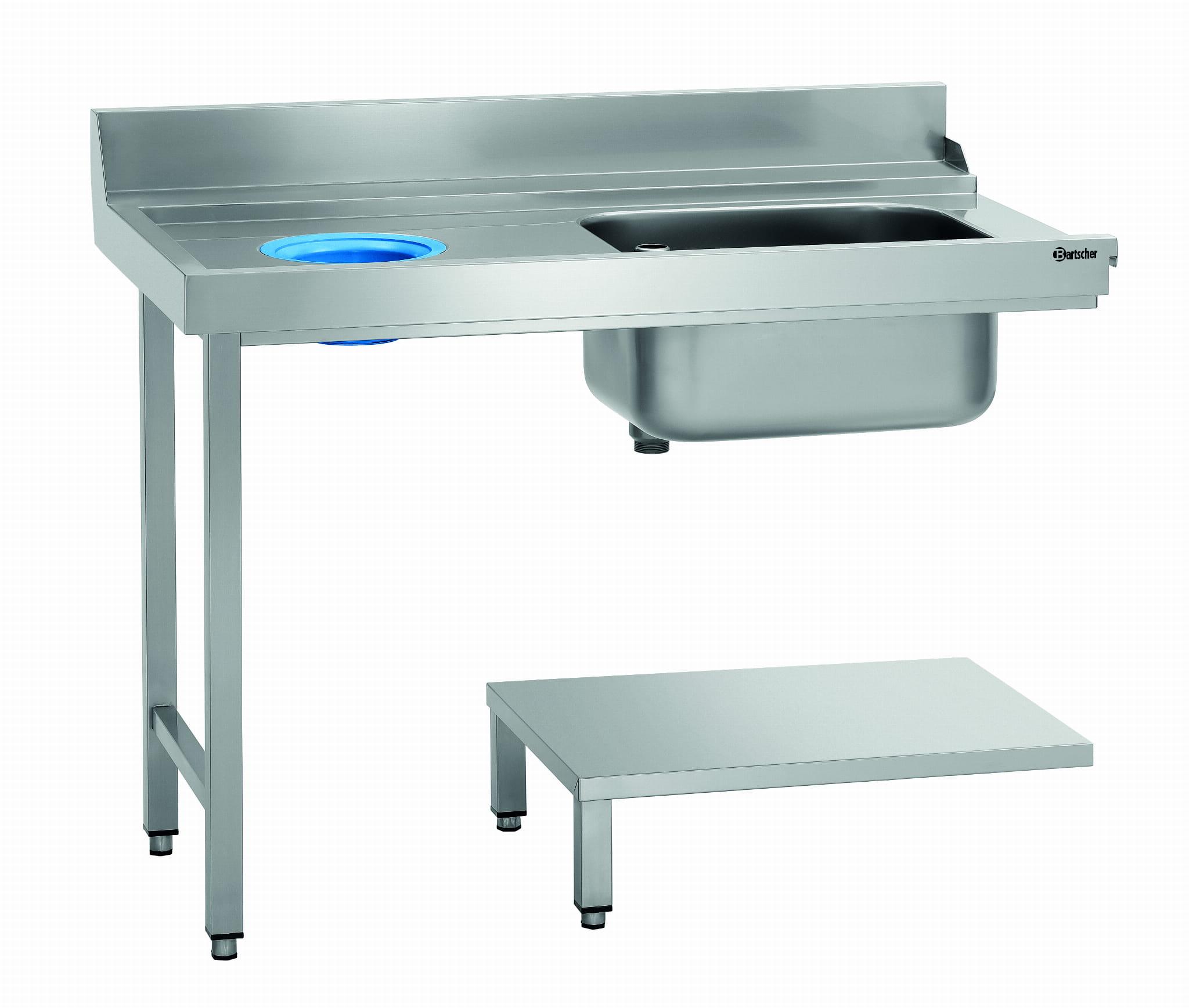 Stół o szerokości 1,2 m ze zlewozmywakiem i otworem na odpadki jest przystosowany do montażu z lewej strony zmywarek przelotowych DS marki Bartscher. Podstawa oferuje powierzchnię na kosze zmywarki.
