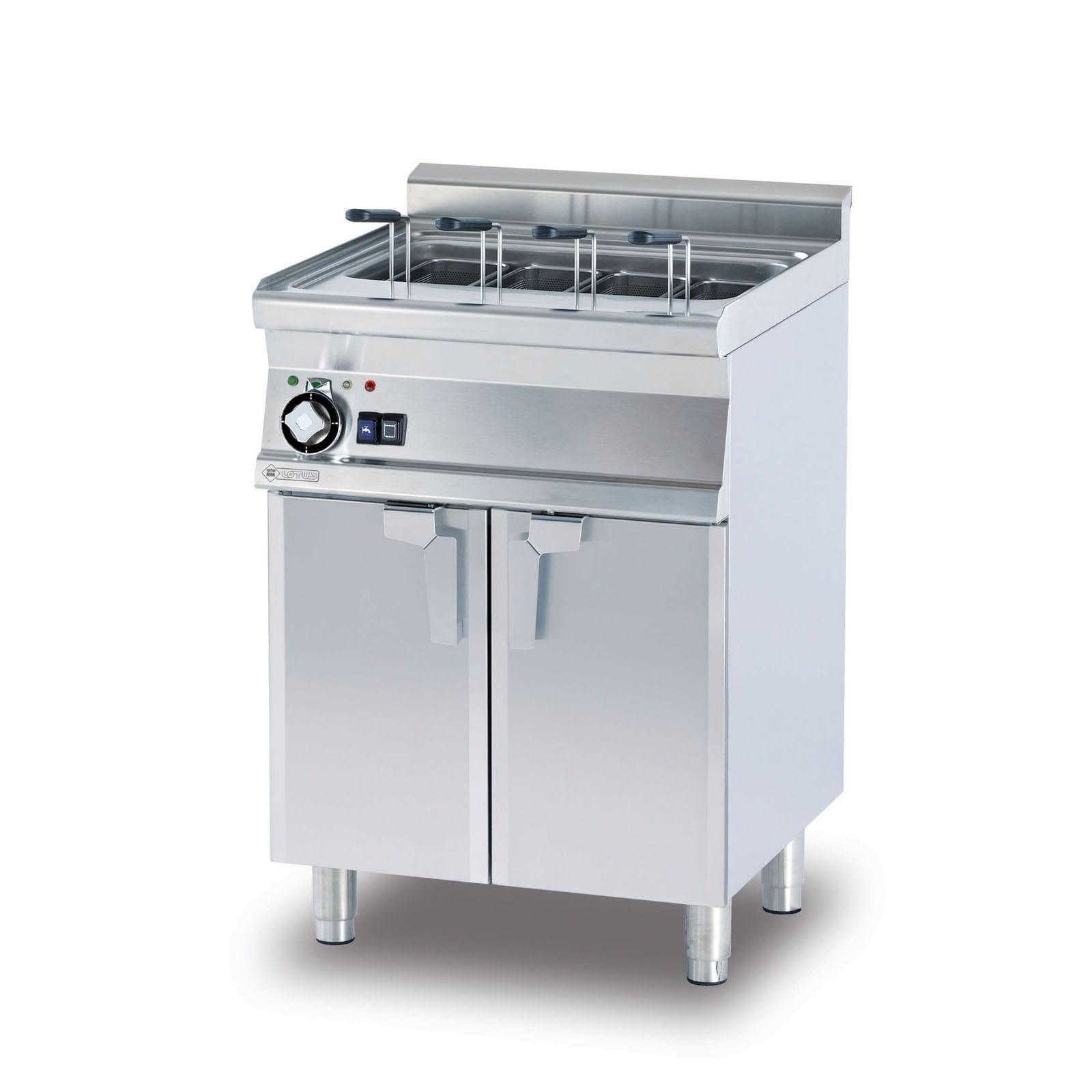 Wysokiej jakości elektryczny warnik / urządzenie do gotowania makaronu o pojemności 40 l umieszczony na zamykanej szafce. Najważniejsze parametry: