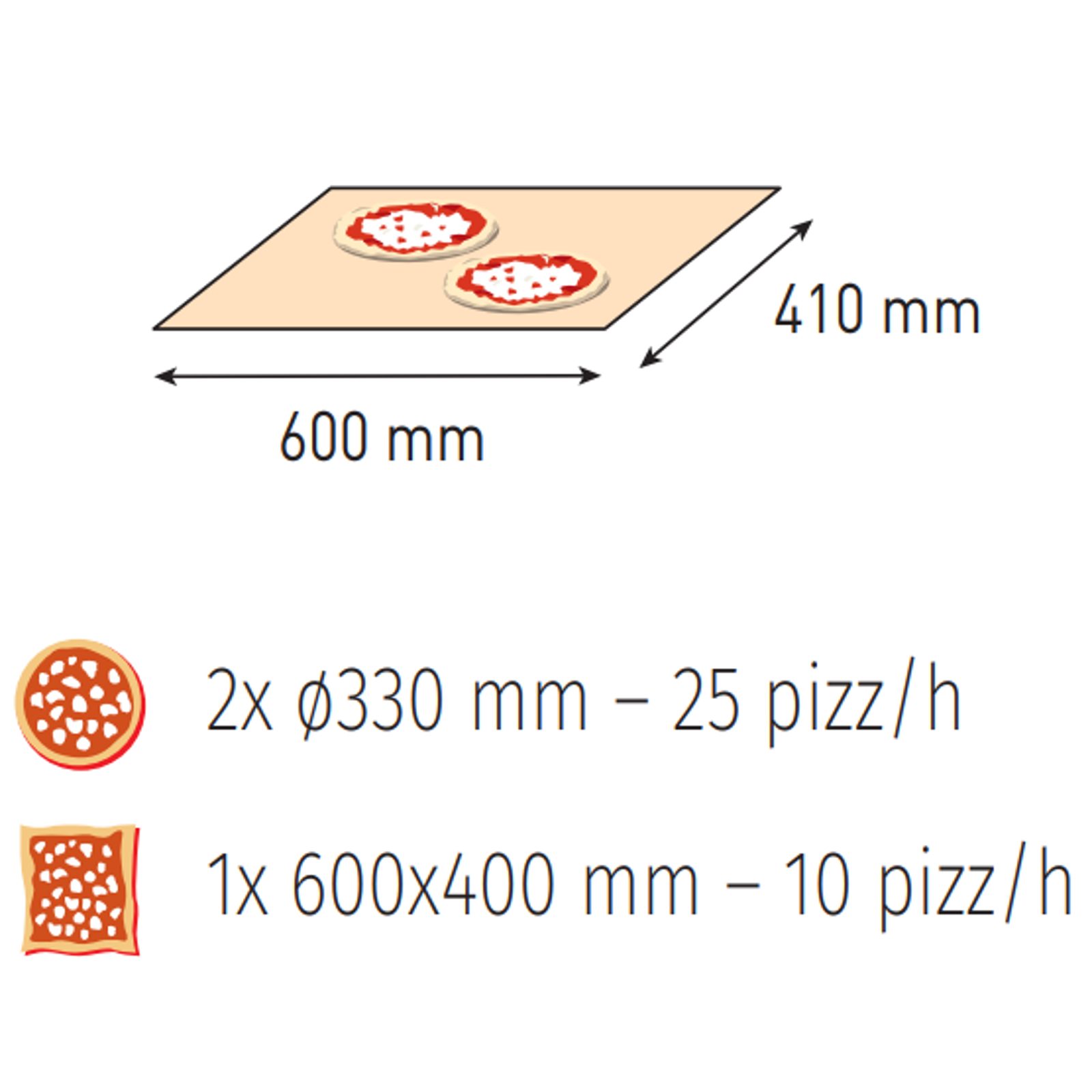 Wymiary komory pieca: 600x410x(H)80 mmMoc pojedynczej komory: 6,9 kWPojemność i wydajność pojedynczej komory pieca:2x śr. 330 mm25 pizz/h -1x 600x400 mm10 pizz/h