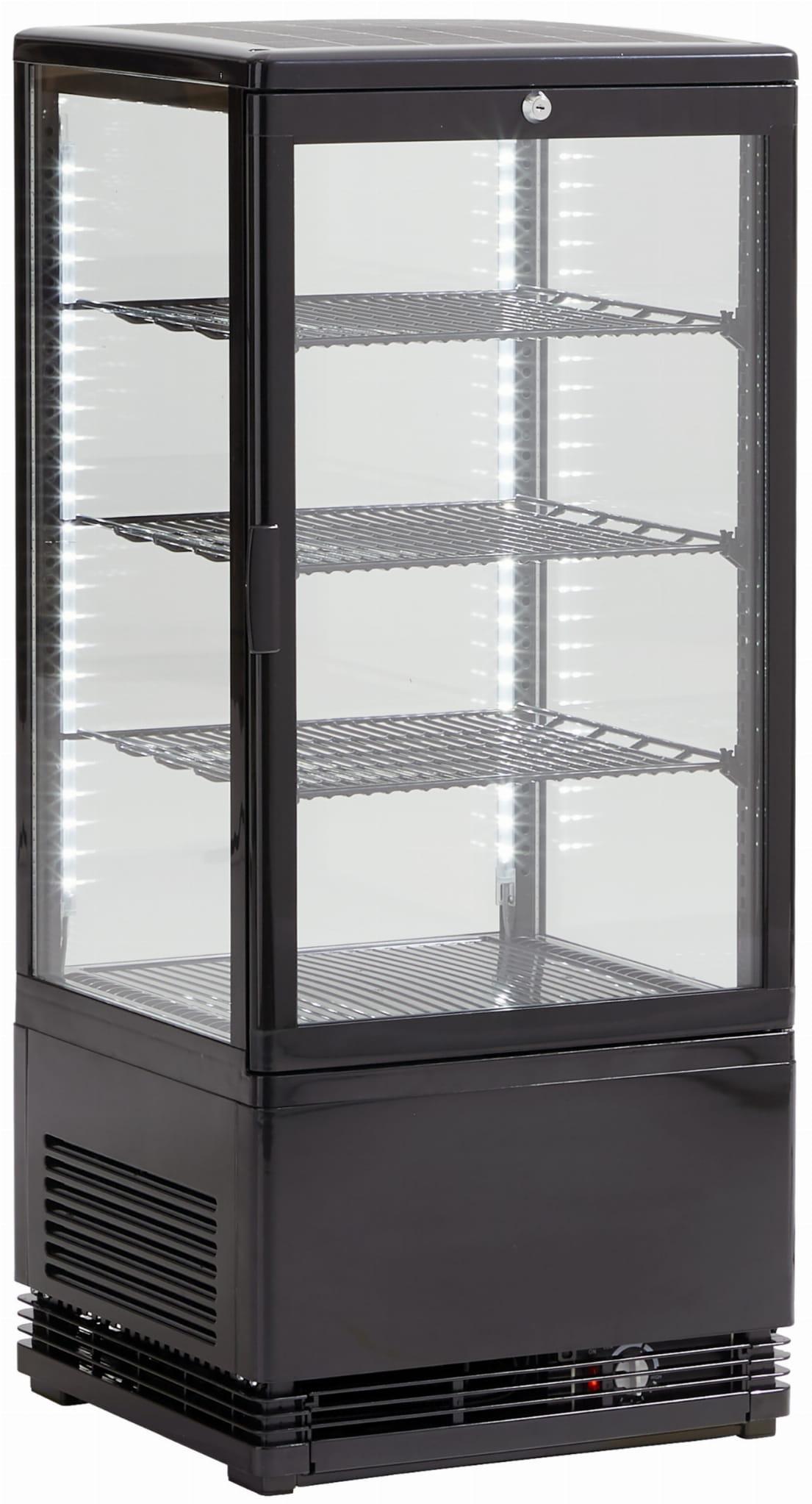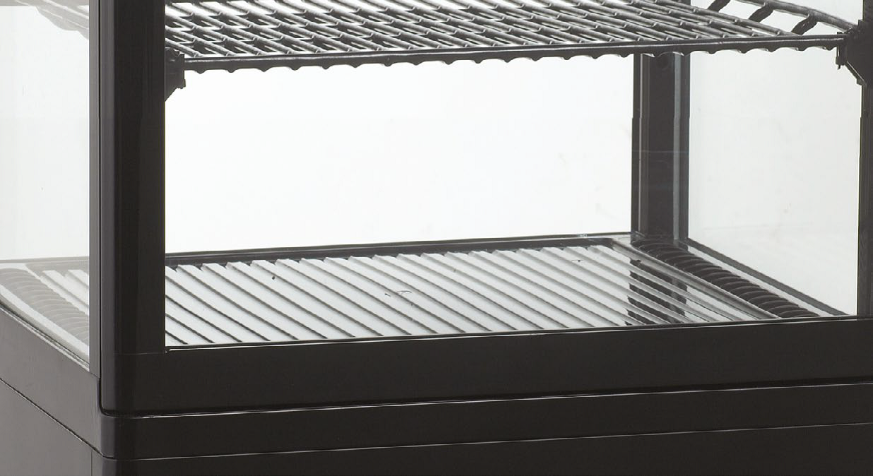 - Przeszklone ścianki witryny pozwalają na ekspozycję produktów z czterech stron